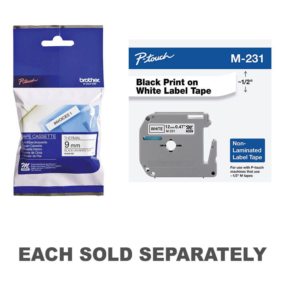 Mit dem P-Touch M-231 ½ ”(0,47") Black-on-White-Band können Sie mutige und dennoch leicht zu lesende Etiketten erstellen, die leicht zu schälen sind, perfekt für den Innenbereich. Dieser halbe Zoll (0,47 Zoll ) Standardthermisch nicht laminierte P-Touch-Klebeband ist gegen Wasserschäden und verschmieren sie nicht. sind perfekt für die Kennzeichnung von Küchen, Regalen und Versorgungsschränken Die Rückseite des P-Touch-Klebebandes kann mühelos entfernt werden, wodurch das Brother-M-Ersatzetikelband einfach zu schälen ist und auf Tische und Regale aus Stahl, Holz, Kunststoff und vielem mehr aufgetragen wird.
