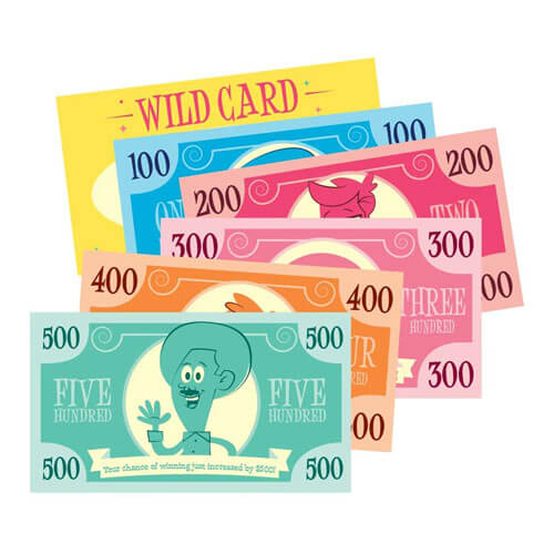- WIE SPIELST DU? - Bei jeder Runde liest Spieler 1 eine der 180 lustigen, kreativen, persönlichen und "geladenen Fragen" vor. Alle anderen schreiben eine persönliche Antwort auf die Frage auf ihren Antwortbogen. Jede Antwort reicht! Der Spieler rechts von Spieler 1 sammelt, mischt und liest die Antworten vor. Spieler Eins wählt seine Lieblingsantwort aus und muss erraten, welcher Spieler welche Antwort gesagt hat. Spieler 1 sammelt für jede richtige Übereinstimmung eine Geldkarte. Der Spieler, der die Lieblingsantwort geschrieben hat, zieht auch eine Geldkarte. Jede Geldkarte hat einen Dollarwert von 100 bis 500 US-Dollar, und Joker werden eingemischt