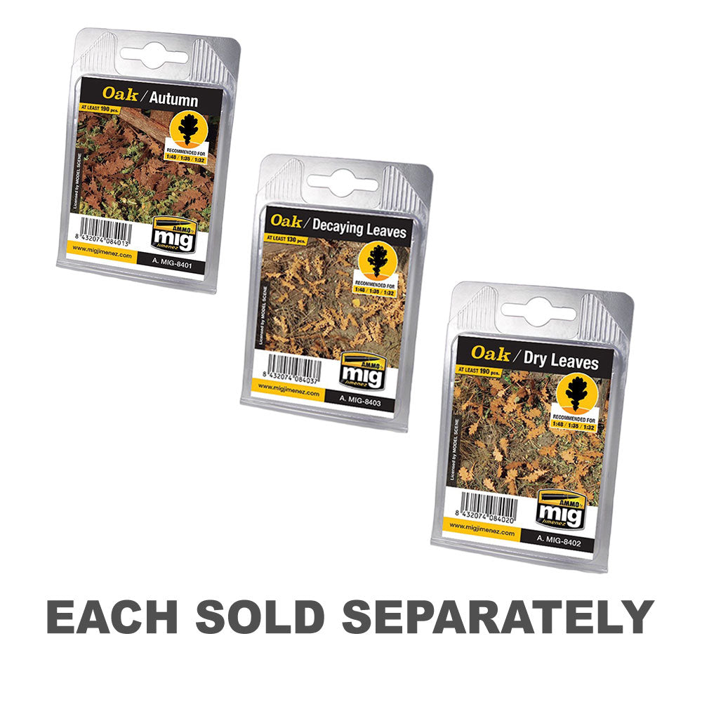 Trockene Eichenblätter aus bedrucktem Papier, per Laser geschnitten, superrealistisch und detailliert. Perfekt, um Ihrem Diorama, Ihren Fahrzeugen oder Figuren den letzten Hauch von Realismus zu verleihen. Einfach mit etwas Weißleim anzubringen. Durch ihre Größe sind sie optimal für die Maßstäbe 1:48, 1:35 oder 1:32 geeignet. Mindestbestellmenge: 190 Stück.