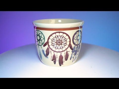 • Gefiedertes Traumfänger-Design auf einer cremefarbenen Schale.
