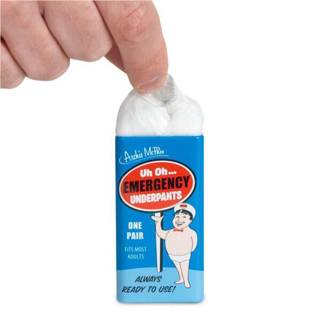 DON'T LET SOILED UNDERPANTS RUIN YOUR DAY! Don't let soiled underpants ruin your day! With these handy Emergency Underpants you'll be prepared for any untimely underpants incidents. Better safe than soggy! Each 3" x 1-1/2" x 3/4" (7.6 cm x 3.8 cm x 1.9 cm) tin contains one pair of disposable unisex underpants made of 50gsm non-woven polyester. Fits most adults.