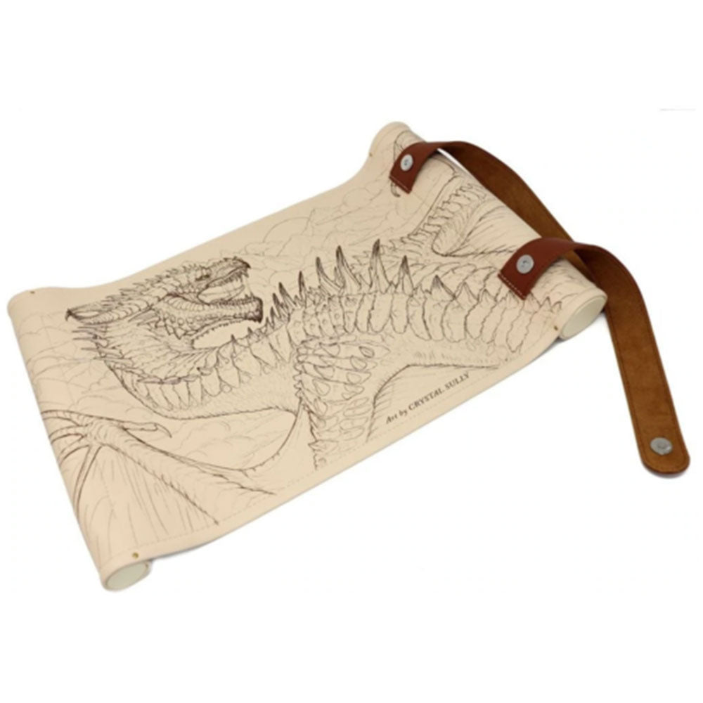 The Dual Scroll of Rolling is a portable hybrid of a rolling tray and dice storage in one snazzy package. The smaller zippered pouch can hold 2 full 7-piece dice sets and comes with a removable foam to help keep your dice padded and cozy. The larger zippered pouch has 3 plastic containers to store dice or minis. When not in use, the scroll is rolled up and secured with two straps, ready to await your next adventure!