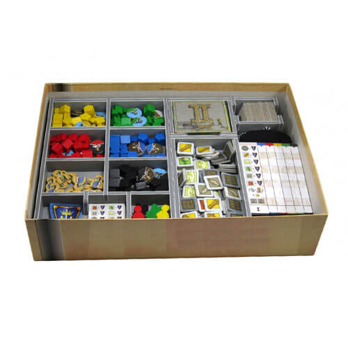This insert is designed to be compatible with Orleans®, and includes space for the 5th player expansion. The design provides both efficient storage and improved game play. Many of the trays can be utilised during the game, and they greatly aid set-up and clear-away times. The boards and player boards act as a lid on top of the trays.