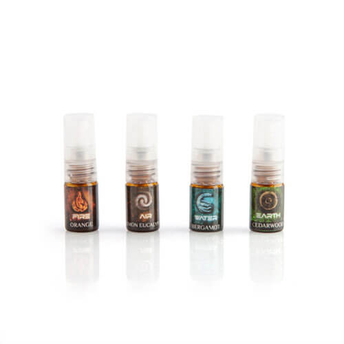 - 4 element & essential oil mixes: fire/orange, water/bergamot, air/lemon eucalyptus, earth/cedarwood.
