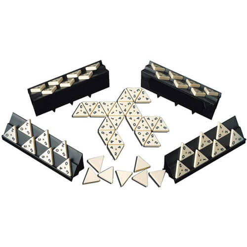 The classic triangular domino game. Score points by matching numbers on the three sided tiles with brass spinners.