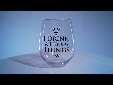 • Black decal reads 'I Drink and I Know Things' with regal symbols.