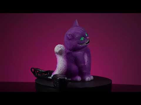 • LED table lamp of a grinning mad cat with vibrant turquoise eyes