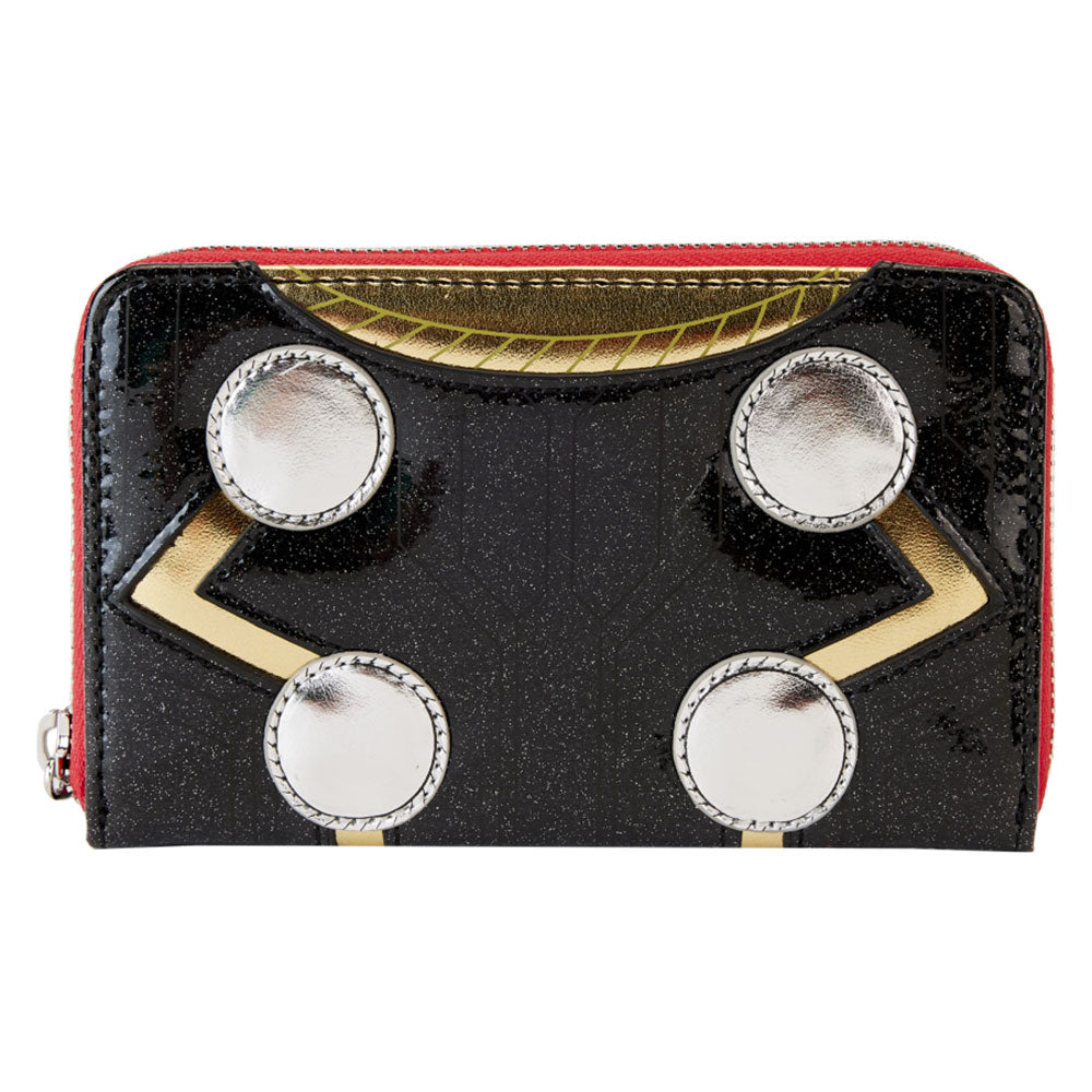 The Loungefly Marvel Metallic Thor Cosplay Zip Around Wallet is made of vegan leather (polyurethane). Wallet zips closed with shiny silver hardware. Additional features include applique, debossed, glitter, and printed details. Take note of the coordinating inside lining.