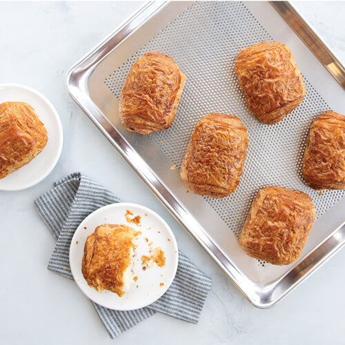 Nordic Ware's Naturals Perforated Crisping Half Sheet is made of pure aluminum for superior heat conductivity and produces consistent evenly browned baked goods every time. Additionally, the airflow created by this pan's tiny holes is perfect for when you want a crisp outer crust for your baked goods such as bread, croissants, dinner rolls, pizza, pretzels, and more.