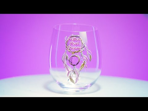 • Hand-blown stemless wine glass featuring a whimsical dreamcatcher "Follow Your Dreams".