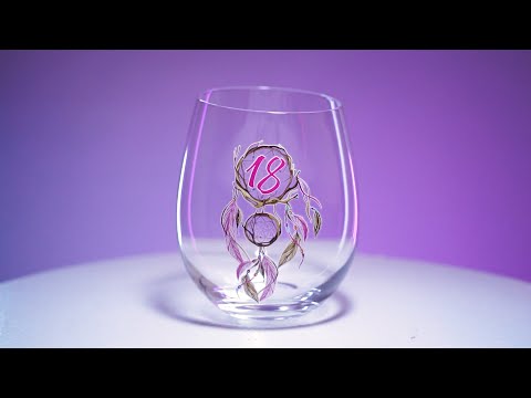 • Hand-blown stemless wine glass featuring a whimsical dreamcatcher "Happy Birthday".