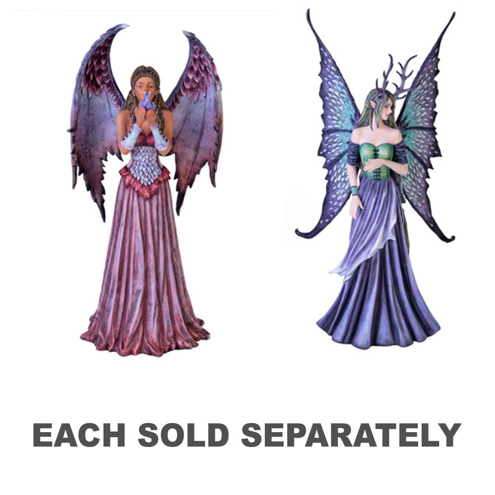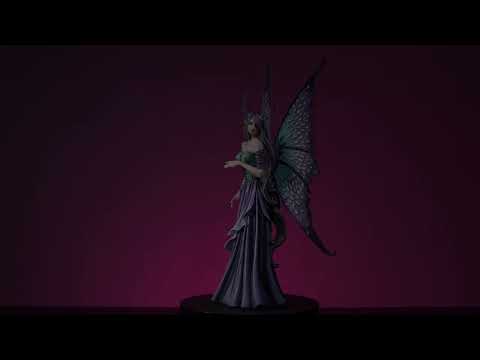 Tyylikäs purppura keiju, joka katselee rakastavasti vauvan lohikäärmettä. Hänellä on korsetti, jota koristavat höyhenet ja virtaava violetti mekko vastaamaan hänen kimaltelevia violetti -siipiään. Yksityiskohtaiset kuvanveistäminen ja maalit, joissa on elinikäisiä tekstuureja.