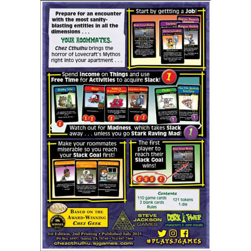 Valmistaudu kohtaamiseen tässä tai millään ulottuvuudessa kaikkein järkevimpien räjäyttävien kokonaisuuksien kanssa. . . kämppiksesi. Chez Cthulhu yhdistää klassisen Chez Geek -järjestelmän kaikkien suosikki vanhemman jumalan kanssa, sekoittaa uudessa hulluusmekaanikossa ja antaa luonnotonta syntymän Steve Jacksonin suunnittelemasta ja John Kovalicin kuvaamasta itsenäisestä pelistä.