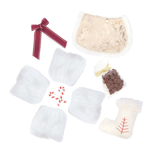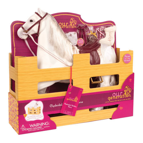 Kaunis hevosystävä, joka jakaa kuohuviini -lomasi! Tämä hohtava valkoinen 50 cm: n leluhevonen on täydellinen hevoselämän ystävä nukkeillesi. Anna nukkeidesi ratsastaa selällä tai vedä hevosta talvikente! Clydesdale -hevosessa on kauniit nylonkarvat, joita on hauska harjata ja tyyliä. Sen mukana tulee neljä pörröistä, faux-fur-hevosen saapikkausta, punainen nauha koristettavaksi, brocade-fabric-satulahuopa ja paljon suloisia loma-asusteita, jotka voidaan jakaa nukkeillesi!