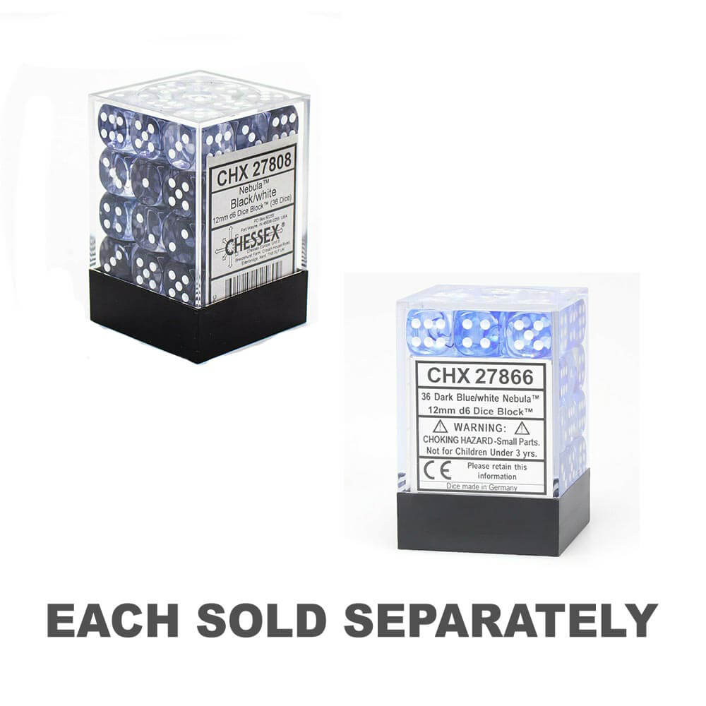 • Nebula 12 mm D6 Chessex Dice -lohko (36 noppaa) - musta valkoisilla pipeillä