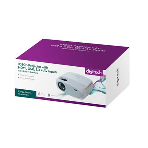 Tämä on kannettava HD-LED-projektori, jonka voit yhdistää HDMI-, AV- tai VGA-videolähteen tai toiston suoraan SD-kortista tai USB-avaimesta sisäänrakennetun mediasoittimen kautta. Projektori näkyy natiivilla 1080p -resoluutiolla ja skaalaa lähteet automaattisesti 480i: sta 1080p: iin. Ihanteellinen toimistoesityksiin tai lasten leikkihuoneeseen. Projektioetäisyys on 1 - 7m, joka tarjoaa noin 32 - 210 tuuman näkyvän koon. Mukana on myös täysi esitelty kaukosäädin.