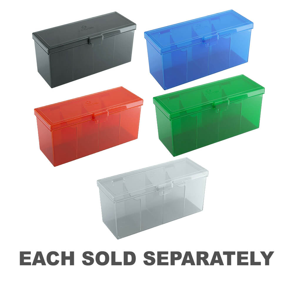 Täydelliset kannet, noppa-, rahakkeet tai 320 kaksoishihaista korttia: on paljon, joita neljästressi pystyy pitämään ja suojaamaan! Tätä tukevaa laatikkoa on saatavana viidessä eri puoliläpinäkyvässä värissä, jolloin sen sisältö voidaan helposti tunnistaa. Integroitu lukko pitää sen turvallisesti kiinni, kun taas kaksi sisäseinää voidaan poistaa suurempien osastojen luomiseksi. Laatikot ovat pinottavia, joten ne ovat molemmat täydellisiä matkakumppaneita ja upea säilytysratkaisu kotona.