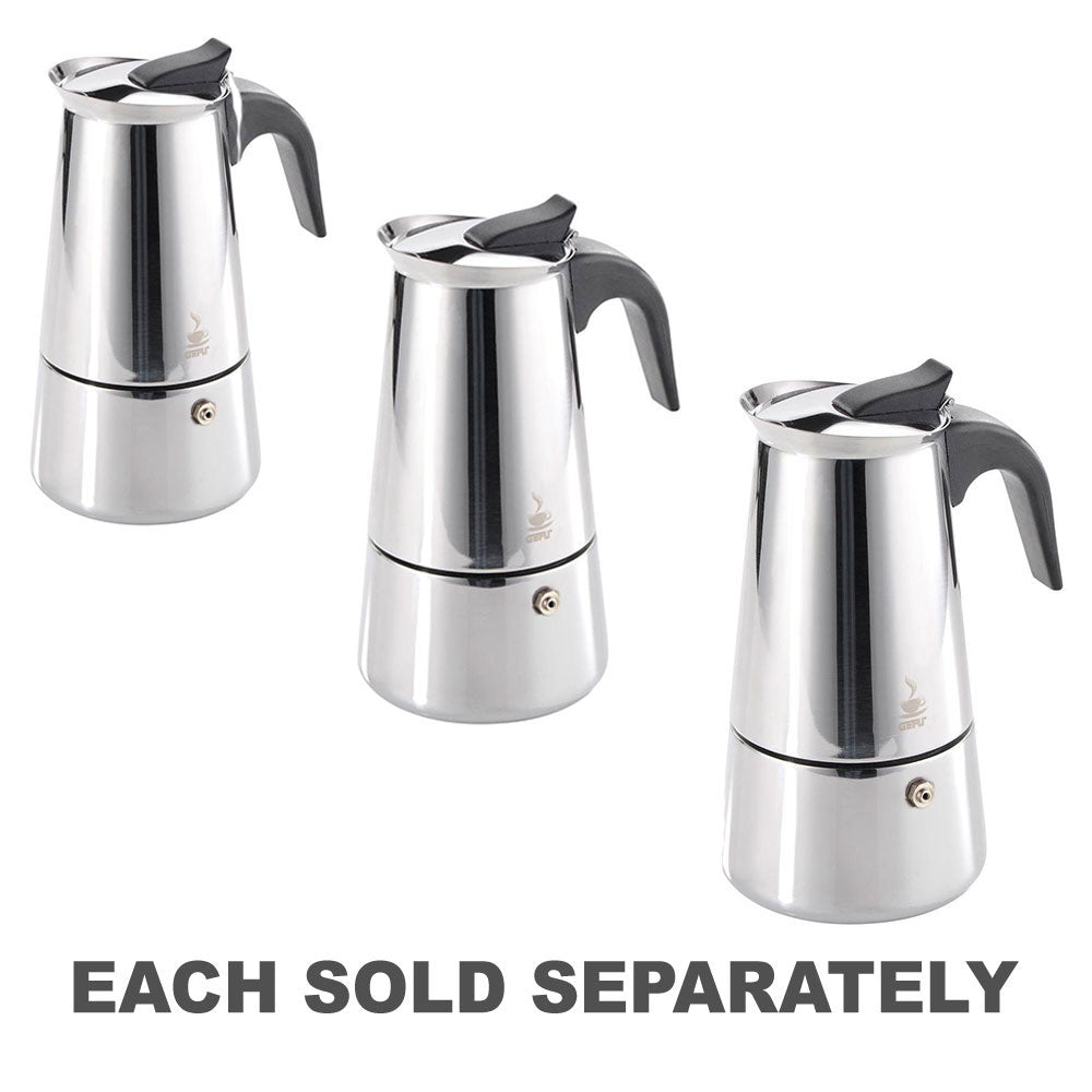 GEFU: n espressovalmistajan avulla voit haastaa herkullisia, aromaattisia espressoja milloin tahansa. Moderni, pitkä laite on valmistettu ruostumattomasta teräksestä ja siinä on musta lämmöneristetty kahva. Kaada vain vettä ja jauhettua kahvipapuja, ruuvaa yhteen ja keitä liesi päälle, kunnes tuoksuva kahvi on valmis - nauti sitten vain. Kapasiteetti: 6 kuppia.