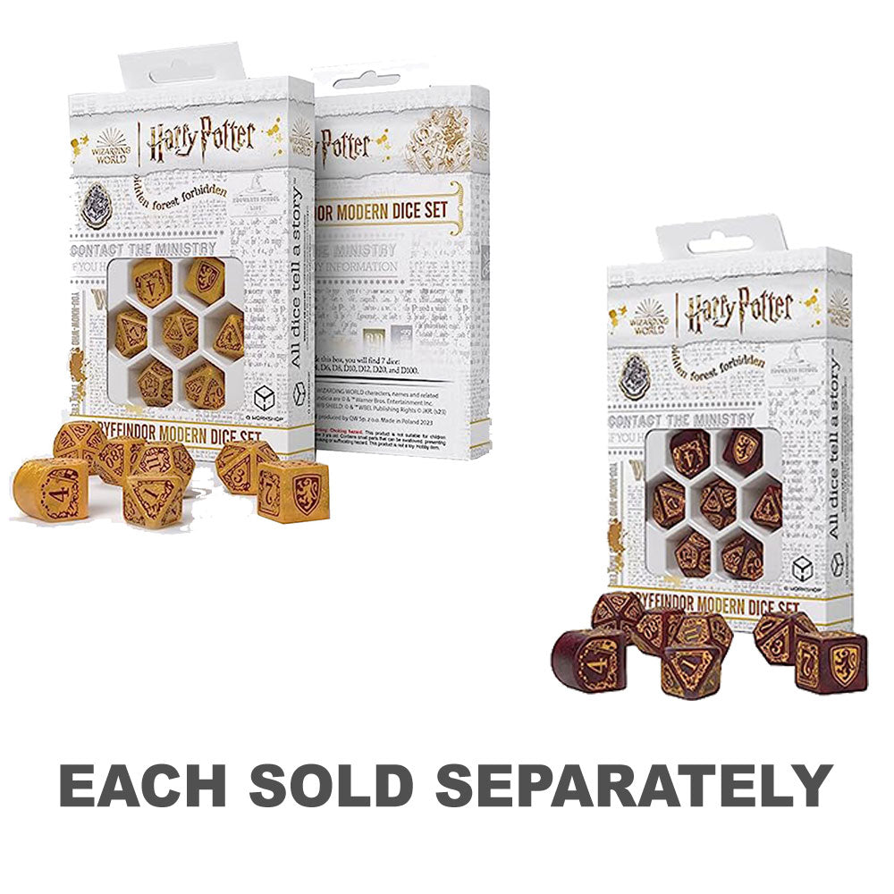 Koe Wizarding -maailman taikuus Q -työpajalla omaksuttamalla modernin noppasarjan: Modern D4, D6, D8, D10, D100, D12 ja D20, omistettu Gryffindorille.