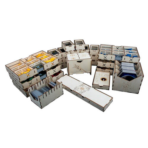 - Erillinen lokero jokaiselle pelaajalle, joka tukee kortteja ja muovikomponentteja