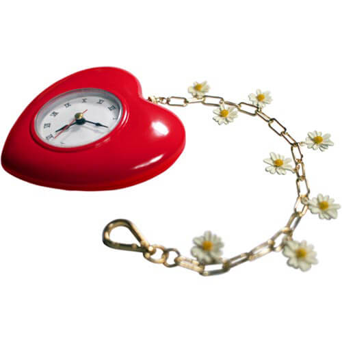 Tämä sydämen muotoinen kello on 11 cm korkeuden, ja siinä on keskustassa toimiva kvartsiketti, joka luo todellisen lyövän sydämen tarvittavan punkin. Sydämeen kiinnitetty on kultavärinen ketju, jota on koristeltu päivänkakkarakukilla ja jossa on hummerileikkeiden sulkeminen.