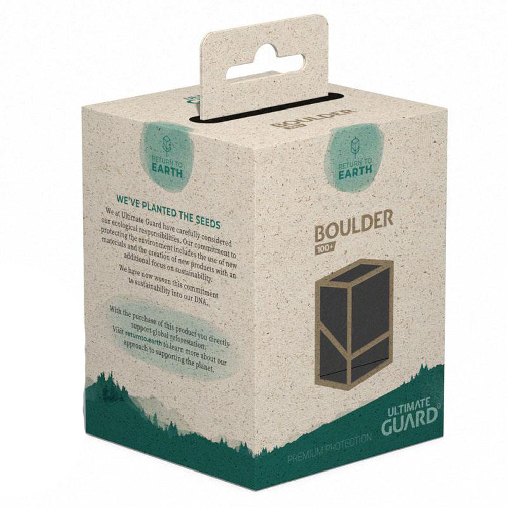 Ultimate Guard on huolellisesti harkinnut ekologisia vastuitamme. Sitoumuksemme ympäristön suojelemiseen sisältää uusien materiaalien käytön ja uusien tuotteiden luomisen keskittyen ylimääräisesti kestävyyteen. Saksassa kehitetty ja tuotettu tämä kätevä ja vankka Boulder 100+, jolla on erittäin helppo avaus, koostuu 97% uusiutuvista resursseista FSC-sertifioidulla ruohopaperipakkauksella. Kannen kotelo on kierrätettävä ja siinä on jopa 100 kaksoishihainen tai 120 yksihihainen korttia, kun käytetään Ultimate Guard -hihaa. Kun ostat tämän palautuksen maapallon tuotteeseen, tuet suoraan globaalia uudelleenistutusta. Vieraile returnto.earthissa saadaksesi lisätietoja lähestymistavastamme tukemaan planeettaa.