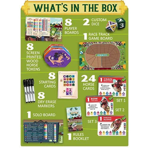Ostat hevosia, sijoitat vedot, vaikuta kilpailuihin ja käytät erityisiä kykyjä. Noppaa määrää, mitkä hevoset liikkuvat, ja käytettävissä olevat toiminnot, joten ole valmis mukauttamaan suunnitelmasi tässä pelissä. Kun kolme hevosta ylittävät maalilinjan, ansiot ovat kokonaisia ja eniten rahaa ansaitseva pelaaja julistetaan voittajaksi.