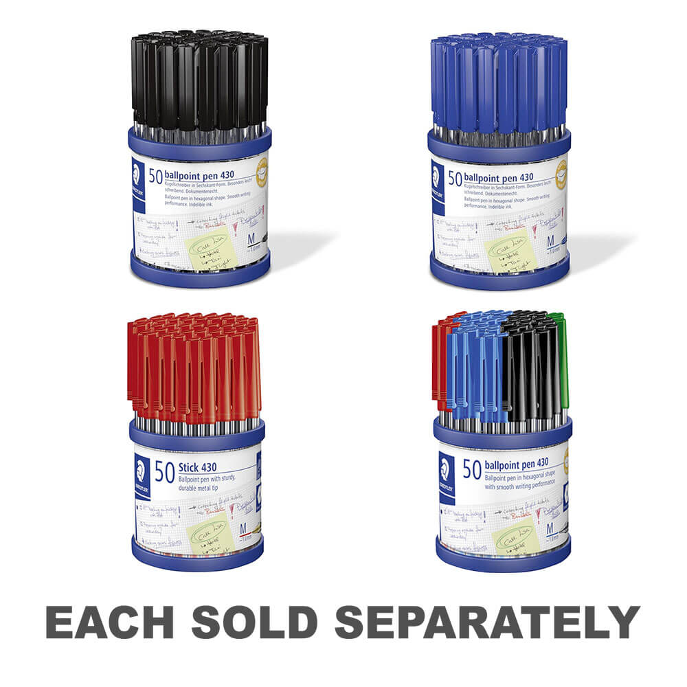Keskipitkä: 1 mm pallon halkaisija 1 mm: n viivan leveys. Säännetty mustevirta tahrien ja naarmuuntumisen estämiseksi. Mukana kylpyammetuki. 50 kynää 430 mustana.