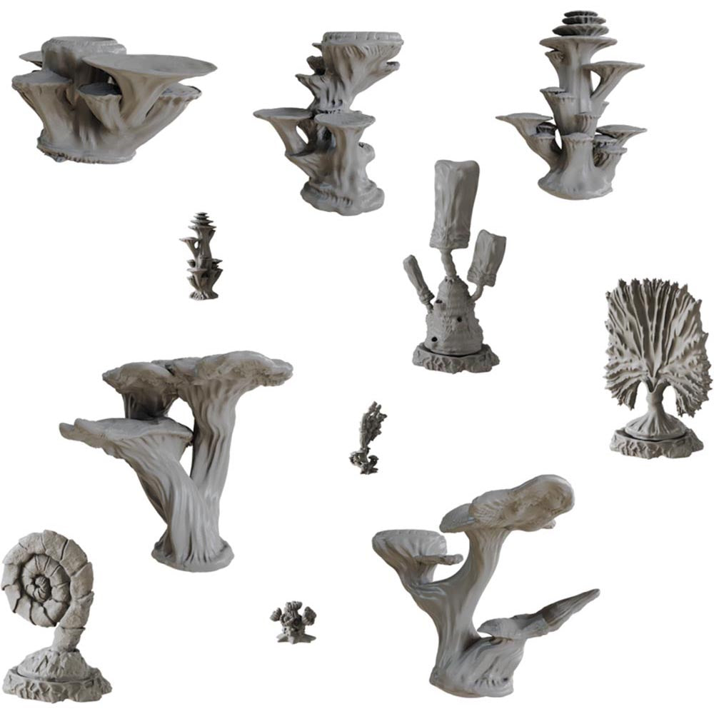 Tällä modulaaristen puiden sarjalla on ulkomaalainen sieni-teema, mutta se voidaan helposti yhdistää muihin sarjoihin, jotta voidaan luoda visuaalisesti upea taistelukenttä fantasiaa ja sci-fi-pelaamista varten. Modulaarisilla osilla on 5 mm: n reikiä magneetteille (ei toimitettu) pelaajille, jotka haluavat yhdistää puunsa jokaiselle pelille!