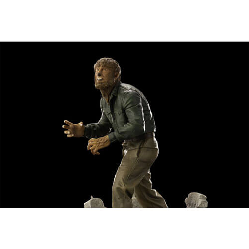 Vahvistellen yön läpi, vanhan hautausmaan betonikivien välillä, hybridi- ja susi -olento tarkkailee täysikuuta valaisevan metsästyskentänsä ja komentavat sen kirotun metamorfoosin. Kerran lempeä ja hiljainen mies, joista vain tuon ajan vaatteet pysyvät ja nyt saalistava peto, jolla on terävät tupsut ja kynnet. Hän ulvoo hänen innokkaiden eläintensä havaitsemiseksi seuraavan uhrinsa löytämiseen, ilmoittaen läsnäolostaan ja rypistymisessä, lunges hyökkäyksestä kuin tappava peto. Iron Studios esittelee patsaansa "The Wolf Man Deluxe - Art Scale 1/10 - Universal Monsters", joka sisältää toisen kauhuklassisen, fanit, joita fanit ovat 1940 -luvulta lähtien.