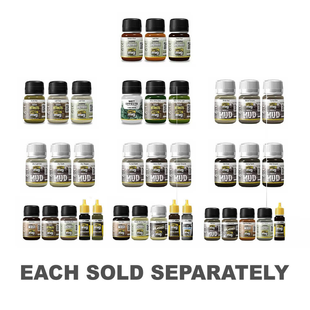 Väsentlig insamling av produkter som jordstrukturer, korrekta spårfärger, samt rost- och dammeffekter för att måla spår i alla torra miljöer. Skapa det unika utseendet på ackumuleringar av damm och slitage unika för AFV: er i torr torr terräng. Sådana hårda och slipande förhållanden skapar effekter av torr rost (A.MIG-1002), polerade metalllänkar (A.MIG-034, A.MIG-192) och ackumulering av damm och pulveriserad jord (A.MIG-1751, A.MIG-3003) Endast med denna all-inclusive multi-media torra jordspår. Uppsättningen innehåller 3 emaljburkar 35 ml och 2 akrylburkar 17 ml: