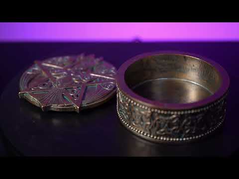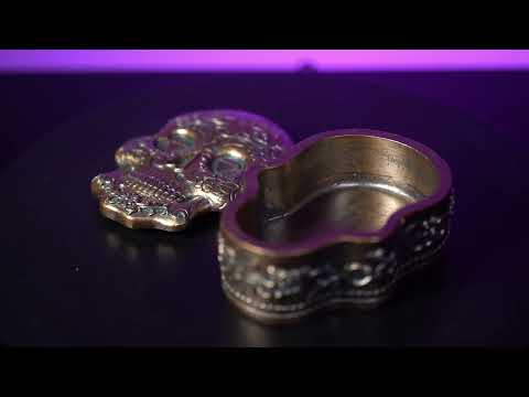 Metall Look Trinket Box med Candy Skull Design. Antik guldfinish och intrikata detaljer gör detta till en vacker funktionell prydnad. Tillverkad av robust polyresin med en lyxig, tung känsla.