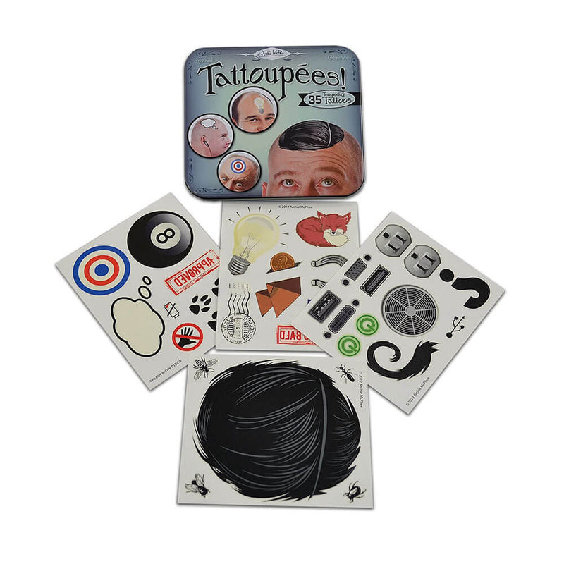 En konstnär är avundsjuk på tomt utrymme, så när vi ser ett skalligt huvud vill vi bara sätta något där uppe. Denna uppsättning av 35 tatueringar på fyra ark är tillfälliga tatueringar utformade för att läggas på skalliga huvuden. Den perfekta presenten till din favorit som är följt utmanade gentleman. Så cool, du önskar att du var skallig. Levereras i en 5 "x 5-1/2" x 1/2 "(12,7 cm x 14 cm x 1,3 cm) illustrerad tenn. Tolv krympade burkar i varje illustrerad displaybox.