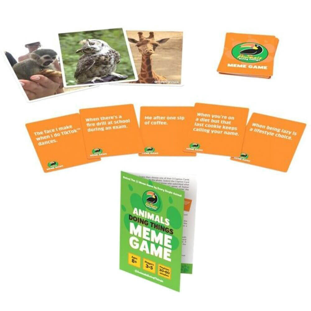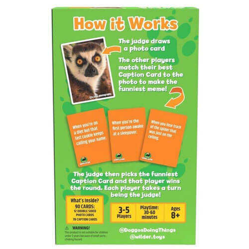 - Levereras med lustiga dubbelsidiga fotokort och det roligaste bildtexten. Koppla ihop korten för att göra memes som kommer att få domaren att skratta.