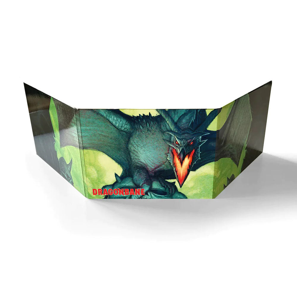 En deluxe Gamemaster -skärm i landskapsformat för Dragonbane RPG. Den har Johan Egerkrans vackra konst på utsidan och en mängd användbara bord och viktig information på insidan, samtidigt som Gamemaster's planer är dolda för nyfikenhetsspelare.