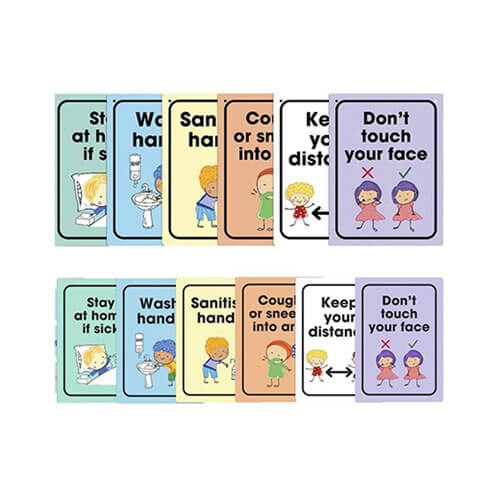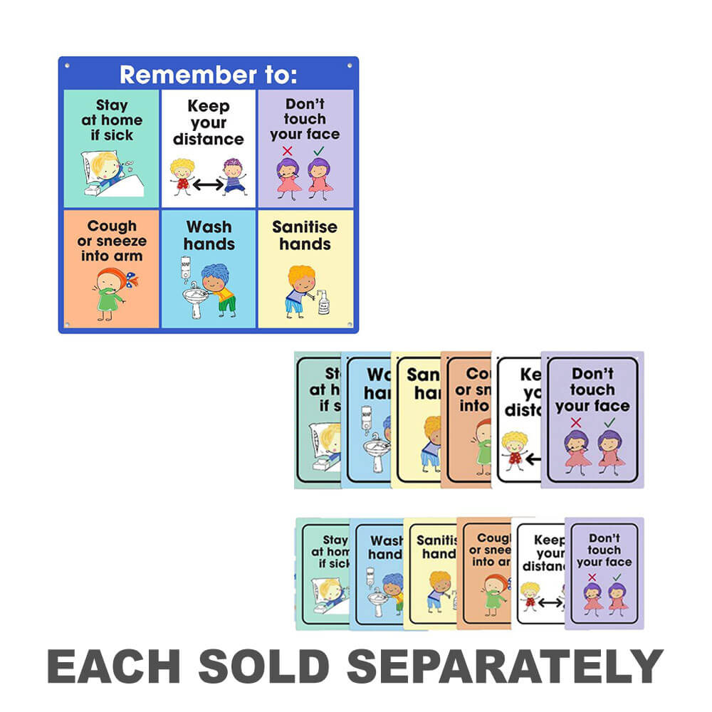 Dessa durusväggskyltar är idealiska för inomhus- och utomhusapplikationer i din skola eller företag, främjar hygien och sociala distanseringsmeddelanden som "Wash dina händer", "Sanity dina händer", "Keep Your Distance" och mer. De har monteringshål överst så att du kan fästa skyltarna till grindar och väggar och de är gjorda av propylen så att de kan monteras med tejp och krok- och slinglim. Dessa tecken har också lärarkort med A5 -storlek som matchar.