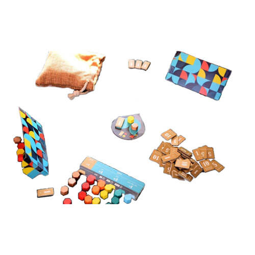- Inkluderar 80 träbitar, 1 tygväska, 4 delande skärmar, 1 Fafnir -bräde, 45 poängchips, 1 skräpbräda och spelhandbok.