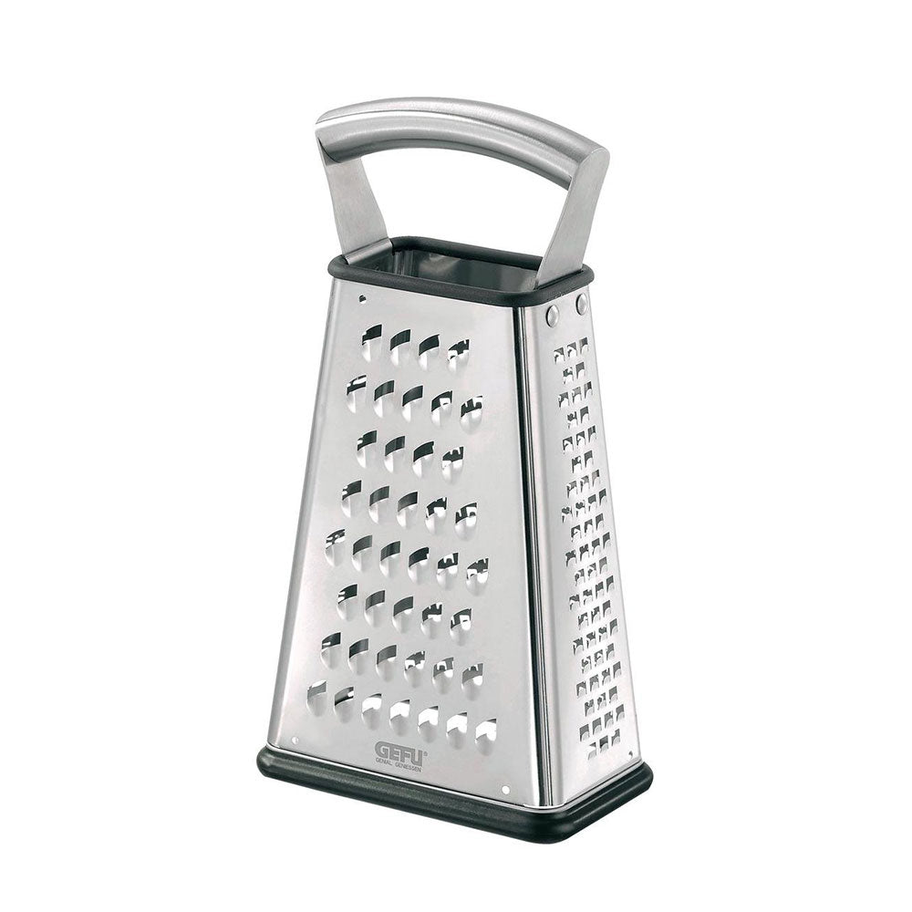 GEFU VIALESS rostfritt stål fyrvägsgrater med laserskuren teknik säkerställer knivskarpa skärkanter och perfekta gitterresultat under lång tid. Tack vare dess fyra olika gittermönster kan det hantera alla grönsaker såväl som ost, chokladgefära och muskot. Fyra gitterytor inkluderar fina rator för choklad, ett grater för grönsaker/mjukost, ett grater för råa grönsaker, hård ostskivare.