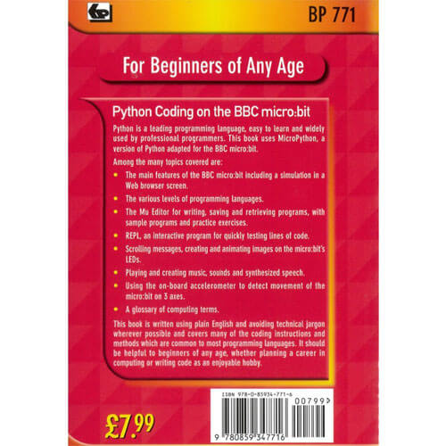 Python är ett ledande programmeringsspråk, lätt att lära sig och används allmänt av professionella programmerare. Den här boken använder Micropython, en version av Python anpassad för BBC Micro: Bit. Den här boken är skriven på vanligt engelska och undviker teknisk jargong där det är möjligt för att täcka kodningsinstruktioner som är gemensamma för de flesta programmeringsspråk. Lämplig för alla ålder eller nivåer av erfarenhet.