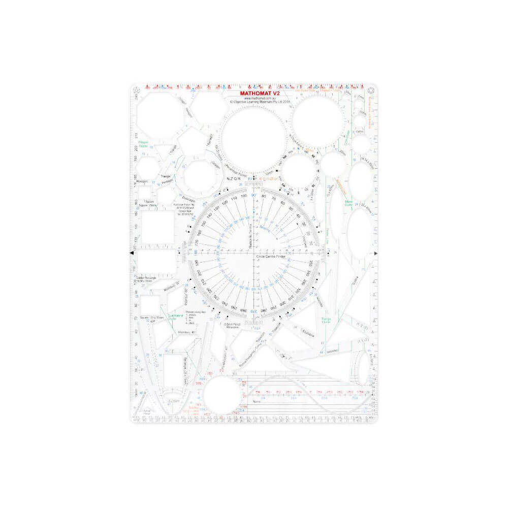 Mathomat -mallar kombinerar många verktyg till ett enda instrument; Linjal, protractor, kompass som ersätter cirklar, många antal linjer och geometriska former stencils, ellipsmallar, grafguider och trigonometriska funktionsmaskiner.