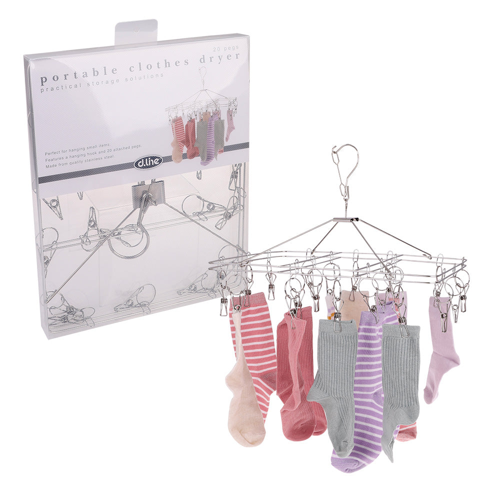 Denna rostfria rektangelklädtorkare - 20 pinnar från D.Line är perfekt för att hänga små föremål, även i det mest kompakta utrymmet. Med en hängande krok och 20 bifogade pinnar är denna kompakta torktumlare utmärkt för att resa och veckas bort för enkel förvaring.