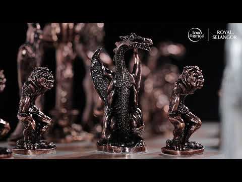 Striden för Middle Earth börjar. Aragorn och Galadriel leder ett band med ent, trollkarlar och hobbiter mot Sauron och Shelobs Horde av Saruman, Gollum, Dragons och Orcs. Gjutet i tenn, med kopparplätering för att skilja de motsatta arméerna, spel äger rum på ett schackbräde av trä- och tennmarmarkit.