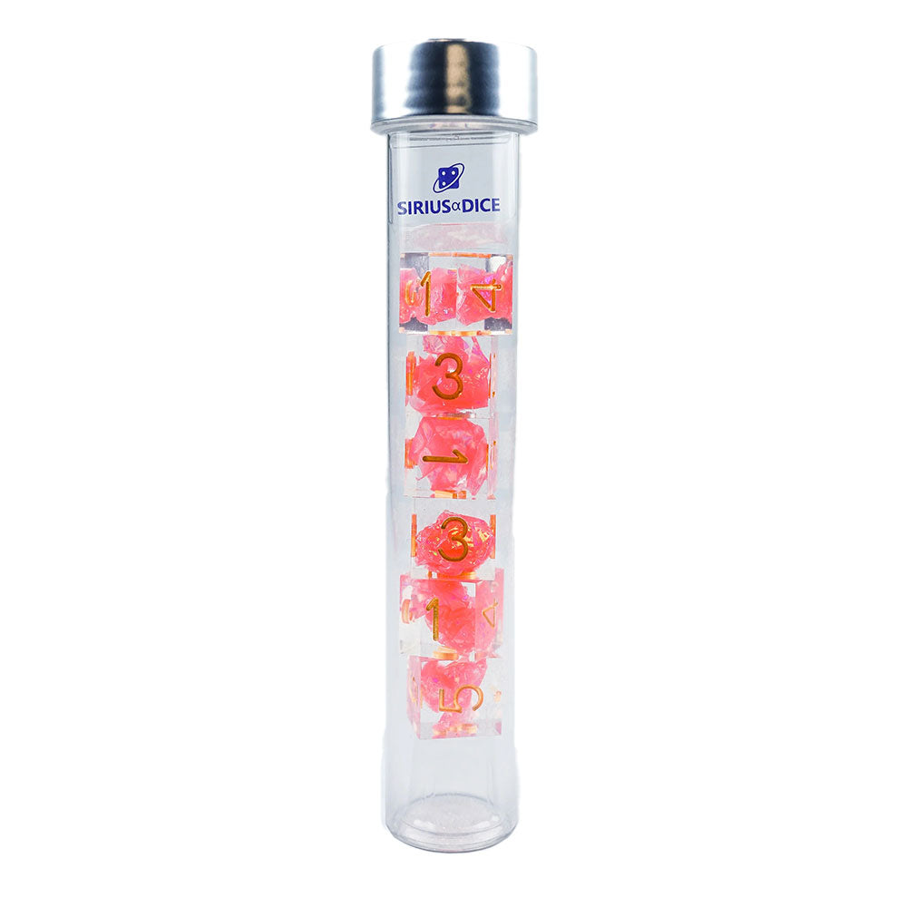 Stick dina rullar med dessa vackra skarpa kantade D6-tärningar. Sex (6) D6 skarpa flamingo-tärningar i ett plattbottenrör. Tärningar är tydliga och har en rosa och en guld virvlande boll i kärnan.