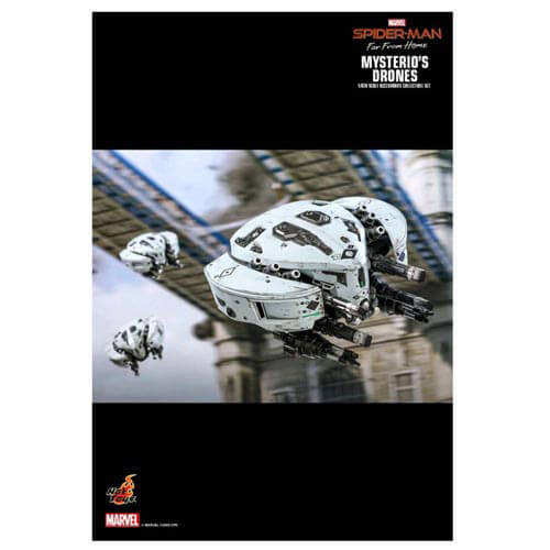 Med tanke på det är noggrant utformat med fin uppmärksamhet på detaljer, har drönstillbehören en 1/6: e skala Mysterio Drones, mäter cirka 14 cm i bredd, 13 cm i längd och 7,5 cm i höjd; Två miniatyrdroner, mäter ungefär 5 cm i bredd, 4,5 cm i längd och 3 cm i höjd; Vackert målade med stridsskadaffekter och sträckor; och en specialdesignad samlarobjekt för att ställa in alla drönare samtidigt.