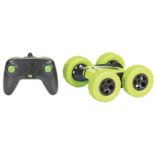Denna högpresterande fjärrstyrda stuntbil är en spänning att köra och älskar att gå snabbt. Den dubbelsidiga hjuldesignen hjälper den att erövra hinder och terräng. 2,4 GHz -fjärrkontrollen har ett intervall upp till 50 m och kör av två AA -batterier (ingår inte). Det 3,7V laddningsbara stuntbilbatteriet ger upp till 18 minuters körning. För att ladda, ansluta den till en tillgänglig USB -strömkälla med den medföljande USB -laddningskabeln. Rekommenderas för åldrarna 6+.