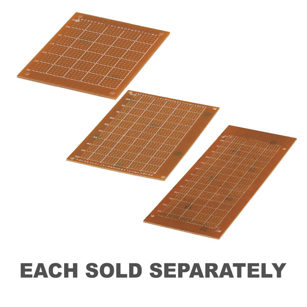 Lågkostnadssättet att bygga prototyper. Varje munk separeras från sina grannar med cirka 0,5 mm gap. Detta isolerar effektivt varje dyna men gör det också enkelt att överbrygga lödet för att göra sammankopplingar. Varje bräde har också "fingrar" på motsatta ändar med en 3,6 mm kant tonhöjd. Dessa kan användas för att ansluta till och från brädet eller till en kortkantkontakt. Slutligen har den icke-lödade sidan av brädet ett alfaphaltigt rutnät tryckt på det för att hjälpa till i komponentidentifieringskortlayout.