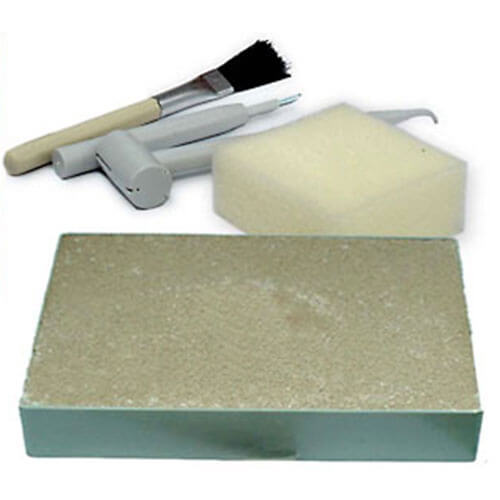 Gräva skelettet från blocket och sedan montera för att kompensera denna kvalitetsreplik. Skelettet består av cirka 8 stycken och paleontologens verktyg (hammare och mejsel) ingår i förpackningen.