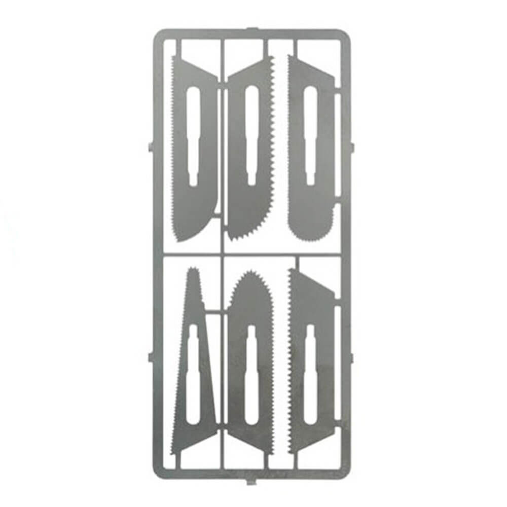 - Uppsättningen innehåller 6 mycket fina sågblad (0,24 mm tjocklek). Utmärkt för intrikat sågning och skärning av plast, trä- och foto -etsade delar. Bladen kan passa alla små föroreningar i skalpellen.