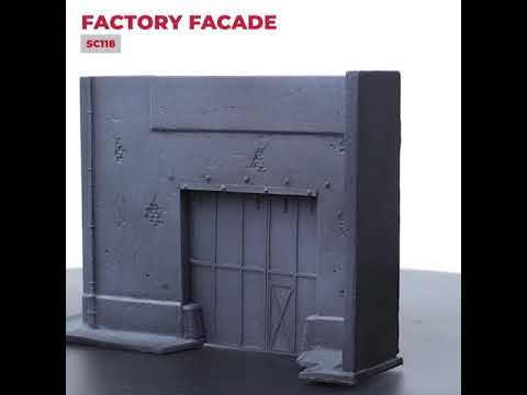 - Framifrån av en fabrik, komplett med metalldörrar och med en hög detaljnivå i strukturerna på sidoväggarna, perfekt för placering på en bas tillsammans med fordon.